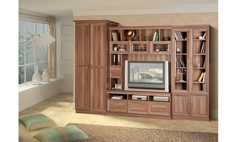«Фламенко-2» - Модульная система для гостиной состоит из 13 отдельных модулей, изготавливается в трех модных декорах. Выразительная древесная текстура придает классической модели современное звучание. Новый массивный профиль и карниз из МДФ, ручки под состаренную бронзу и элегантный орнамент на фасадах, нанесенный по технологии шелкографии, добавляют мебели респектабельности и изысканности.