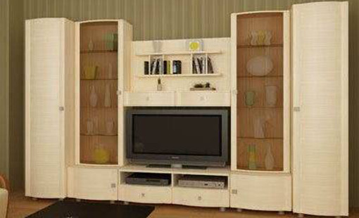 Стенка Оливия №18 является современной вариацией классических гостиных , обычно включающих в себя низкую тумбу и две узких витрины. Роль витрин в данном случае исполняют две ТБ-308 и две колонки ШК-330 с остекленными дверцами. Комод заменила тумба ТБ-307 для видео аппаратуры, без двух полок ПЛ-301 и антресоли АН-306, образующие единую панель, композиция смотрелась бы менее гармонично, и больше походила бы на уши кролика. По краям примыкают, как завершающий акцент, высокие платяные шкафы ШК-303, они оснащены полкой и штангой, но можно доукомплектовать один из них дополнительными полками (получится бельевой шкаф). Поскольку длина всей стенки более трех метров, предполагается что она предназначена только для больших комнат, но это не так. Длинные комнаты-пеналы становятся еще уже и длинней, если установить мебель от угла до угла. А вот маленькие, уютные, квадратные комнатки можно визуально увеличить именно за счет такого расположения, только следует оставить свободным центральное пространство помещения.
